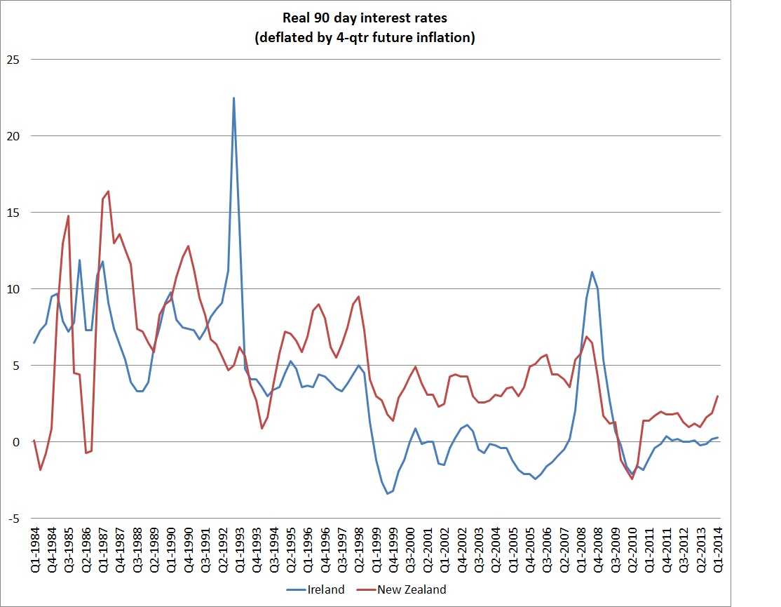 The Irish could, and no doubt should, have managed the boom years better. But what they got looks a lot like what one would expect if one takes an economy with a neutral interest rate that might have been similar to New Zealand’s and gives it an actual interest rate set mainly for Germany and France. If New Zealand nominal interest rates had been set at German, or US, levels since the late 1990s we would have ended up with a pretty spectacular bust as well. Honohan runs the Irish version of this chart in his speech.