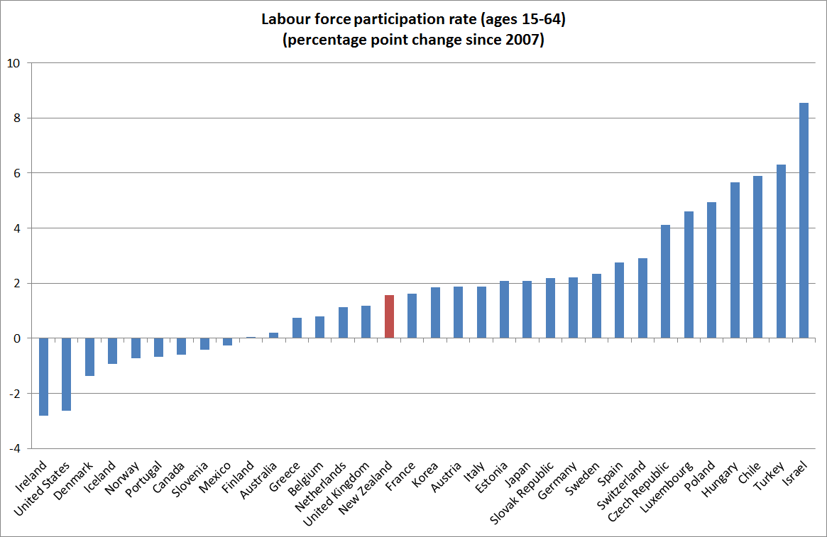 1) It’s not surprising that LFPR hasn’t risen as much in NZ relative to other countries: we were already at 68.5 in 2008 and didn’t drop below 68 in any of the years since. We’re basically top-bound.