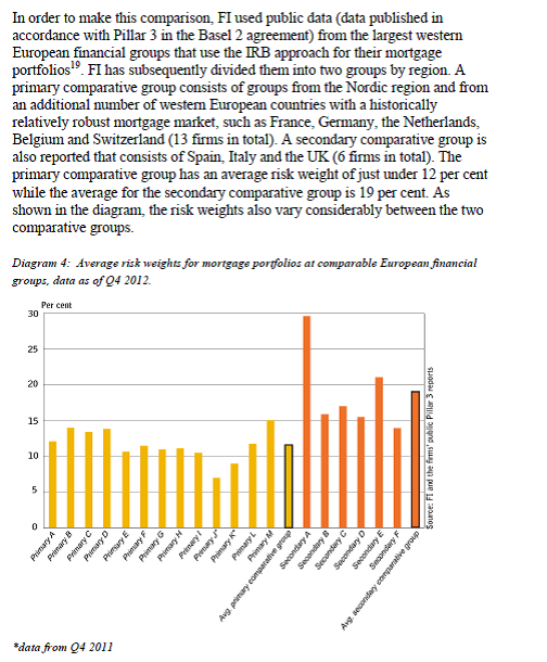 Sweden recently raised the minimum risk weights used by their banks on residential mortgages. As part of the preparation for that move they produced this document, which includes this chart. Again New Zealand risk weights on residential mortgage loans are higher than any of the banks in this chart – and are higher than the newly increased Swedish risk weights.