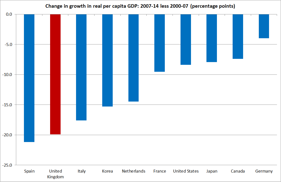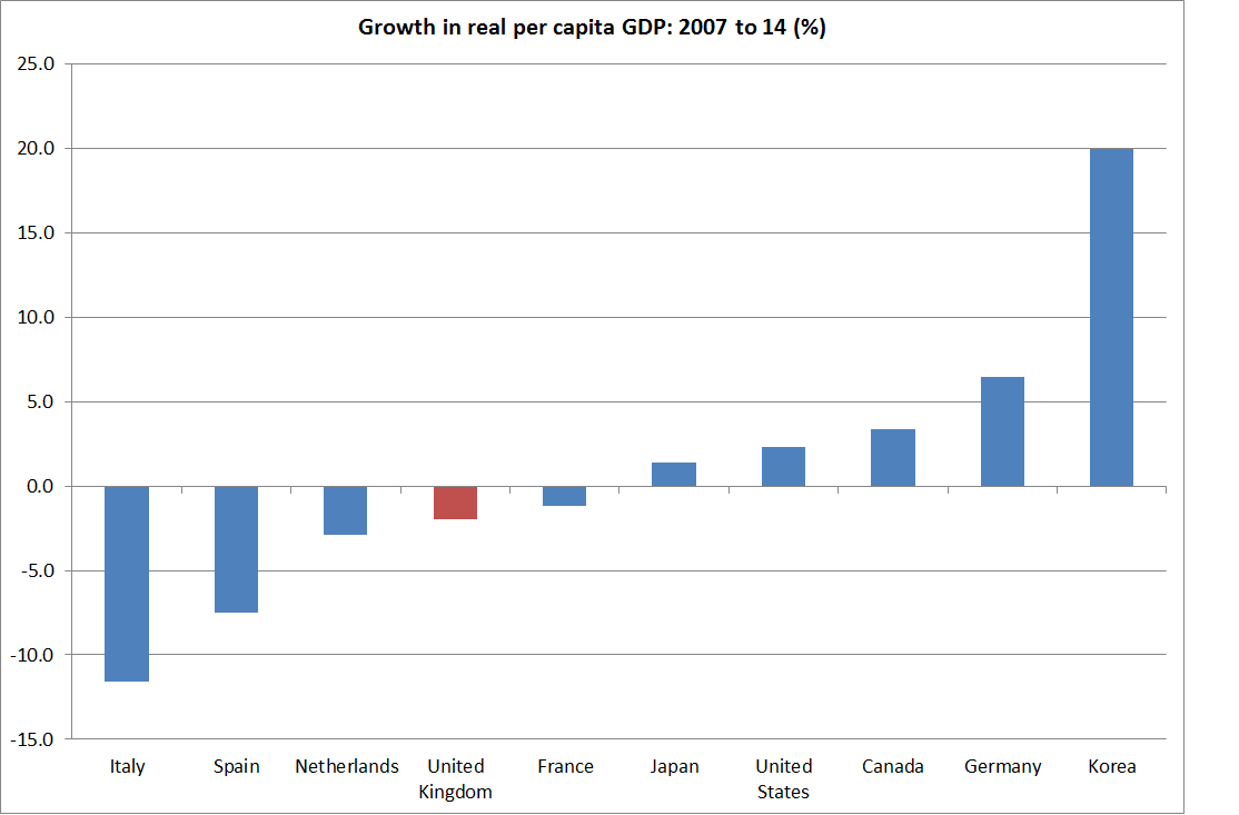The first was per capita real GDP growth from 2007 to 20014. The median country had had around zero growth over 7 years, while per capita GDP fell 2 per cent in the UK.
