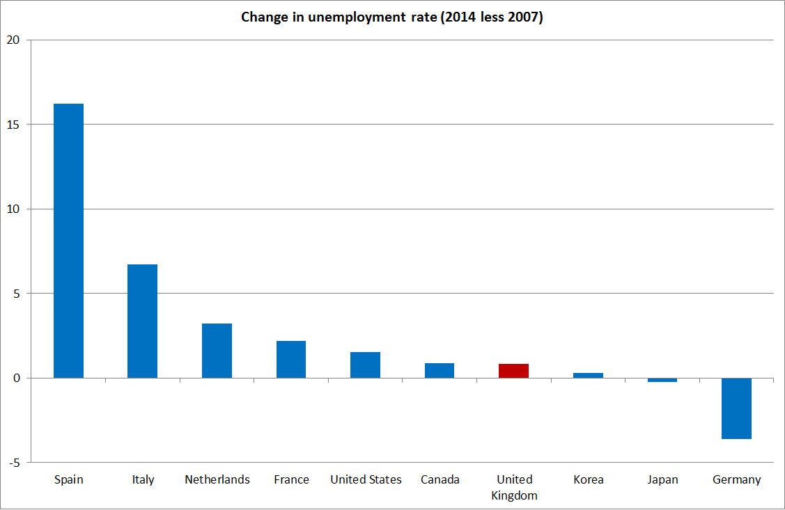 Unemployment rates in 2014 were higher than those in 2007 in eight of these ten countries. Here the UK scores relatively well, with an increase less than one percentage point.