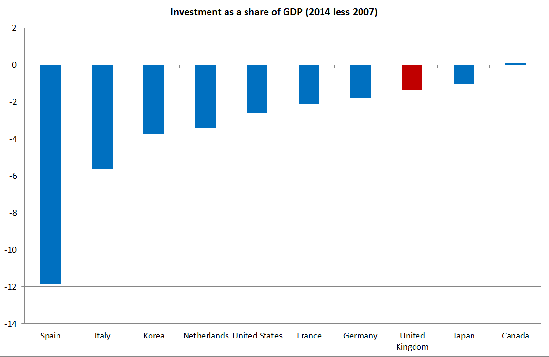 Investment as a share of GDP differs widely across countries, but in all but one of our countries, the investment share was lower in 2014 than in 2007. The UK doesn’t do too badly on this measure either.