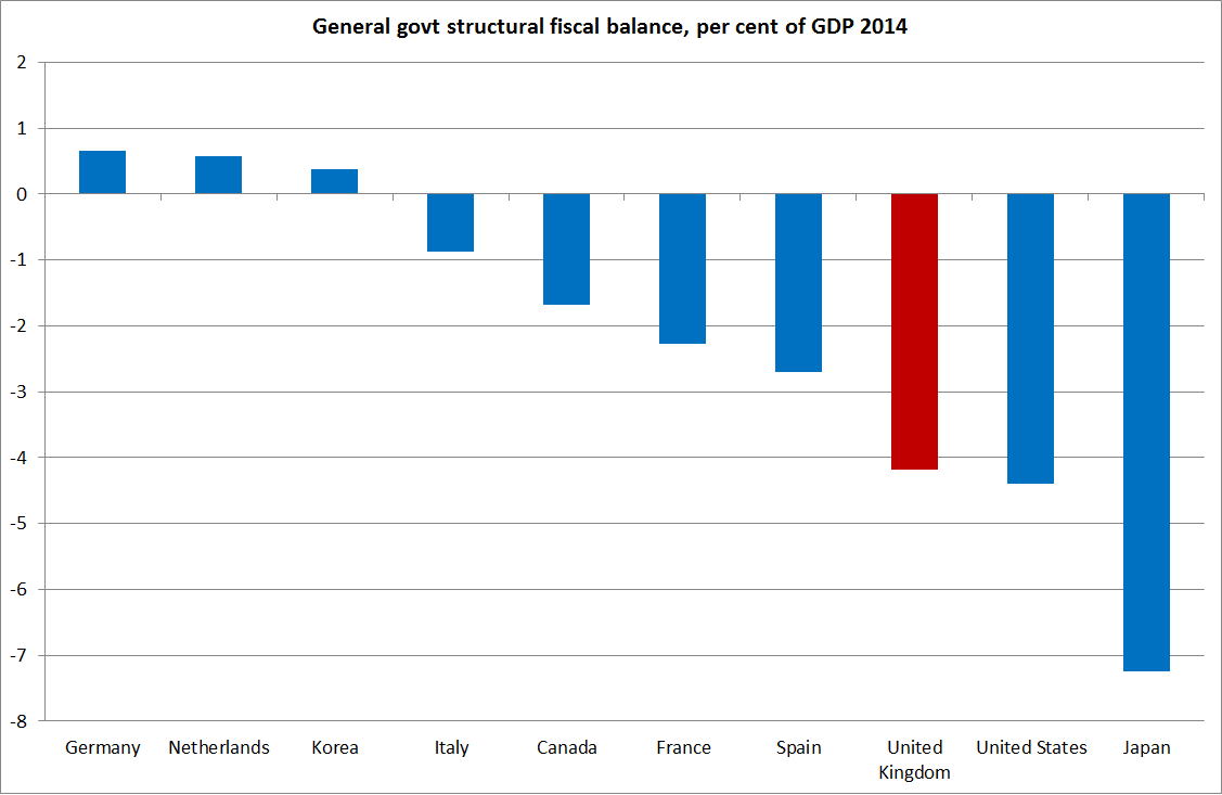 Much of the political-economic debate around the UK in recent years seems to have been around fiscal “austerity”. The IMF estimates that the UK’s structural fiscal deficit, as a share of GDP, was a bit smaller than it had been in 2007. But…..the imbalance in the UK’s fiscal accounts, on this measure, last year was still third largest of these 10 countries.