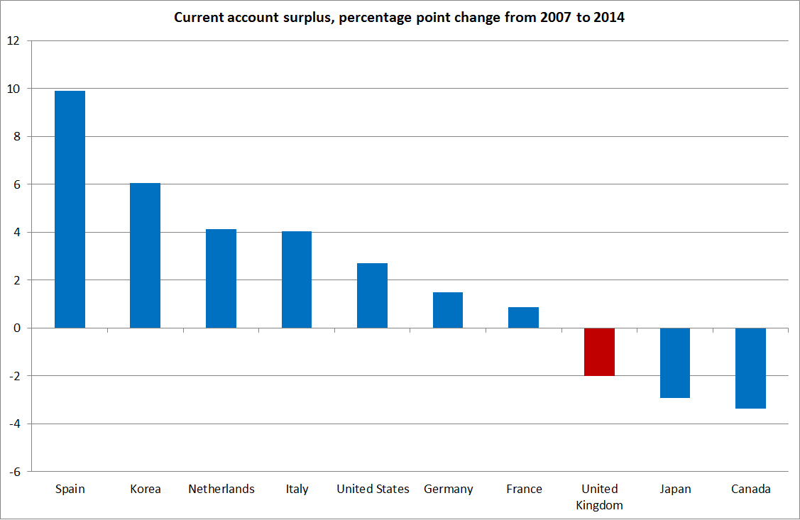 And finally, the current account balance. At 4.8 per cent of GDP, the UK had the largest current account deficit of any of these countries. If we look at the change in the current account balance from 2007 to 2014, the UK has had the third largest reduction in the current account surplus (or increase in the deficit). There is no simple way to interpret whether this is a good or bad thing, but I imagine the UK authorities would be feeling a touch nervous if the deficit were to get much larger than it is now.