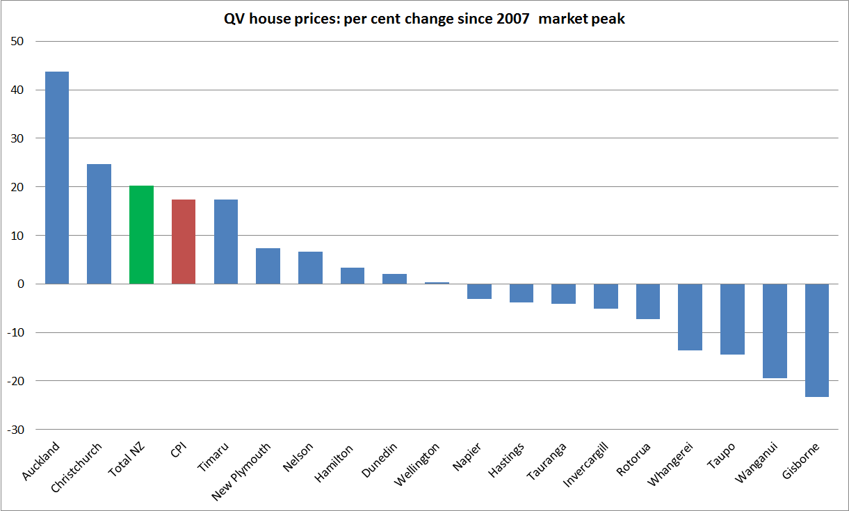 Take the current situation by contrast. Yes, Auckland house prices are a social and political scandal, but they seem quite easy to explain on the basis of some simple fundamentals: restricted effective supply of developable land on the one hand, and rapid population growth (fuelled by cyclical differences between here and Australia, and an aggressive government programme of inward migration). Where that combination of pressures isn’t apparent (which is most of the rest of the country) there is no particular or unusual upward pressure on house prices. Indeed, in large parts of the country real house prices are lower than they were in 2007, the peak of the previous boom and just prior to the recession.