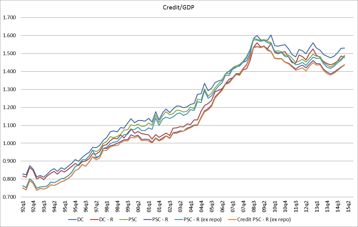 The Reserve Bank has six credit aggregates on its website. Each has its advantages and disadvantages, but the overall picture is much the same whichever one one looks at. This chart shows all six, as a ratio to nominal GDP, up to March 2015 (I’ve included a guess for nominal GDP growth in March quarter). Credit to GDP peaked back in 2008, and in the seven years since then has shown no hint of moving to new peaks. Given the sharp upward trend over the 15 or so years prior to 2008, this is a huge change.