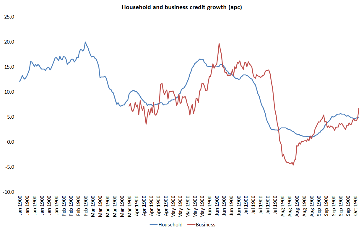 And what of annual growth. This chart shows lending to households and the businesses (the latter including agriculture). Lending growth to households has only been materially lower than it is now during the 2008/09 recession.