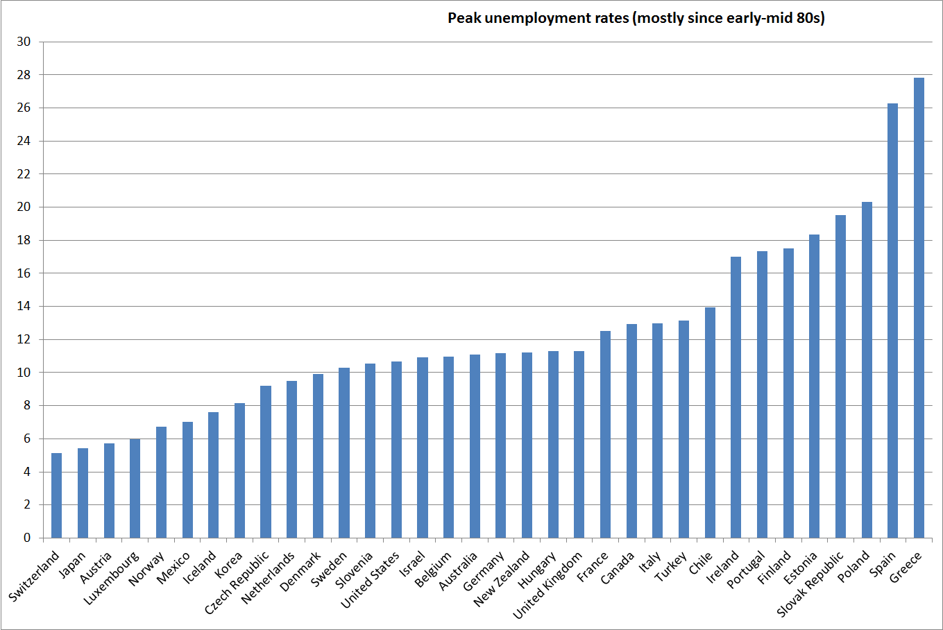 Here is the chart of the highest unemployment rates on record for each of the 34 OECD countries. Only 13 of the 34 countries has had an unemployment of 12.5 per cent or above in more than 30 years.