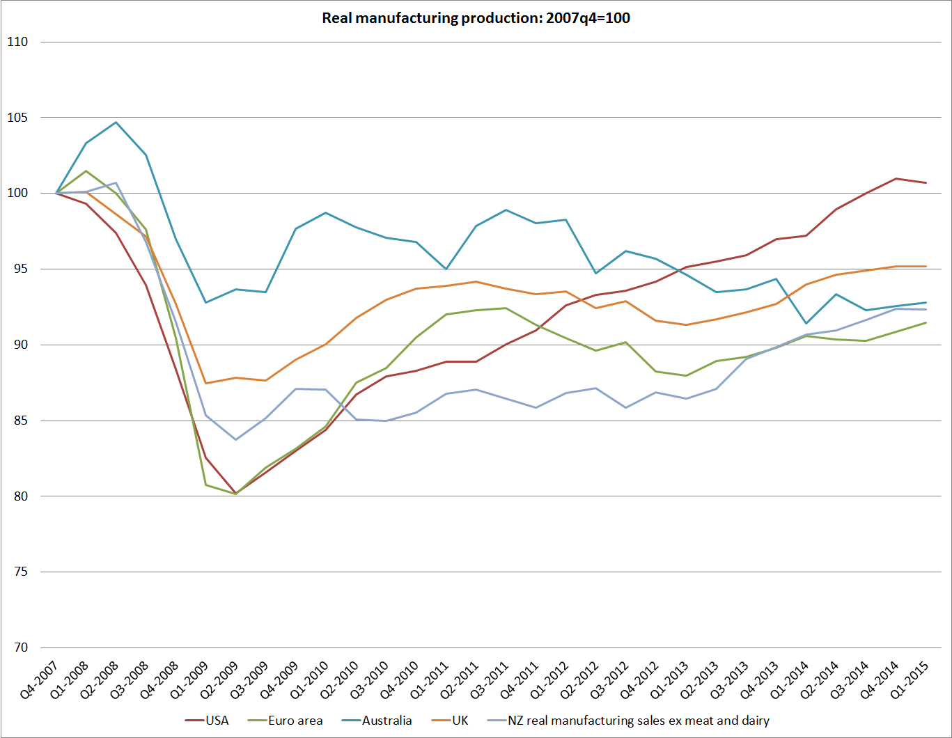 But this chart shows the volume of manufacturing activity (not as a share of GDP, not per capita, just the level) for a few countries/areas since 2007q4. For the other countries, it is OECD data, while for New Zealand I’ve used the volume of manufacturing sales ex meat and dairy (the rather less noisy series SNZ also publishes).