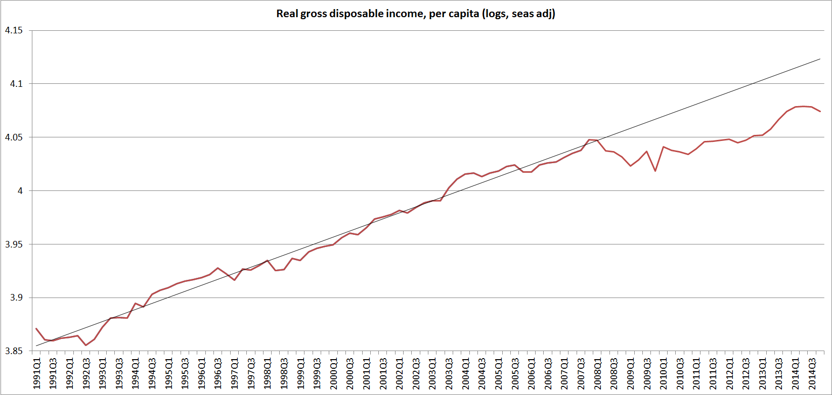 I’m not one of those who thinks that the relative decline of manufacturing is a tragedy, but on the other hand I also don’t think that it is a matter of total indifference. Most likely, the relatively weak manufacturing sector performance in recent years, despite the buoyant construction sector, is a reflection of the persistently high real exchange rate. Like Graeme Wheeler, I think the real exchange rate is out of line with medium to longer–term economic fundamentals. A more strongly performing New Zealand economy, one making some progress in closing the gaps to the rest of the OECD, would be likely to see a stronger manufacturing sector. It might still be shrinking as a share of a fast-growing economy, but a manufacturing sector that has seen no growth at all in almost 20 years doesn’t feel like a feature of a particularly successful economy.
