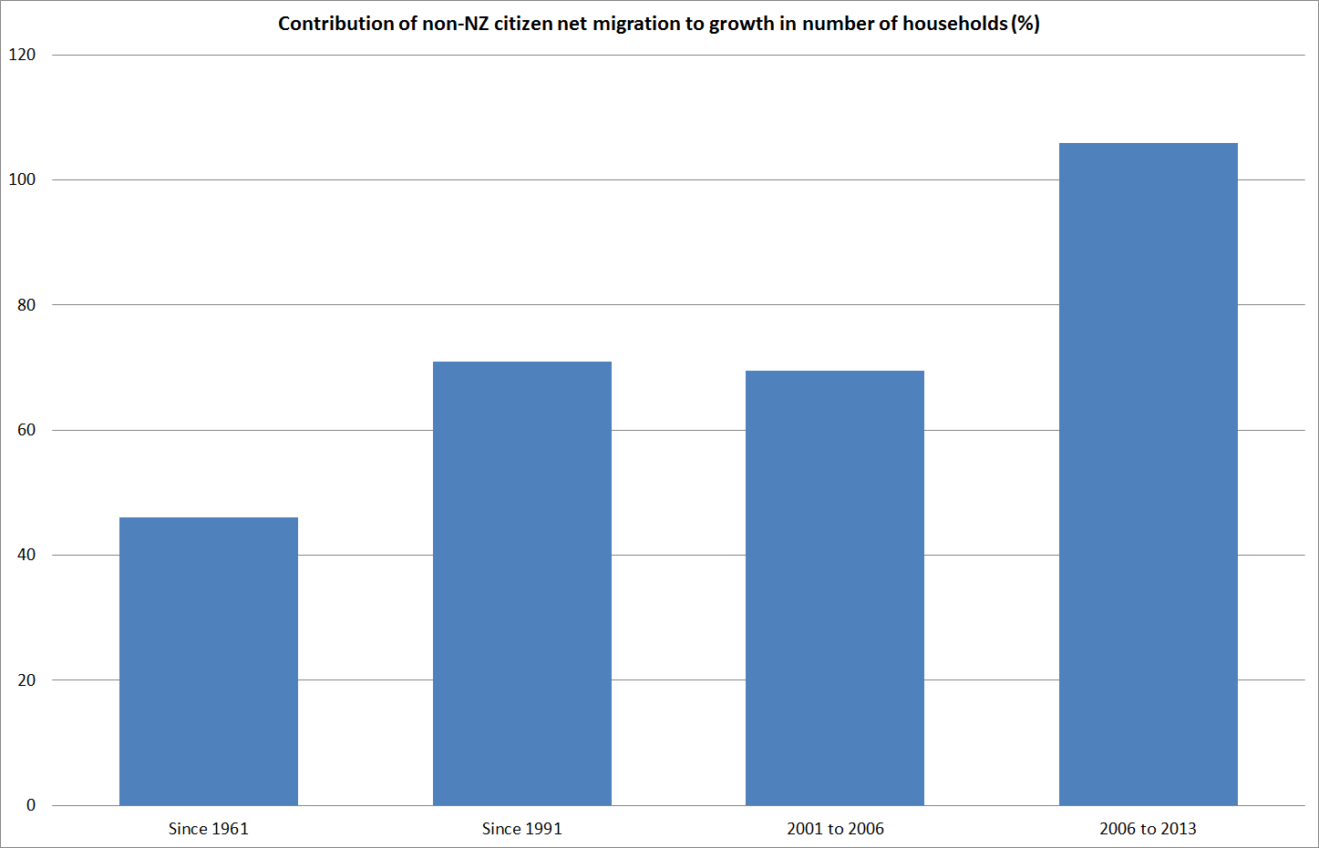 From 1991 to 2013, non-New Zealand citizen immigration accounted for around 71 per cent of the change in the number of households (or dwellings required). For the last two intercensal periods the contributions of non-New Zealand citizen net immigration were as follows: