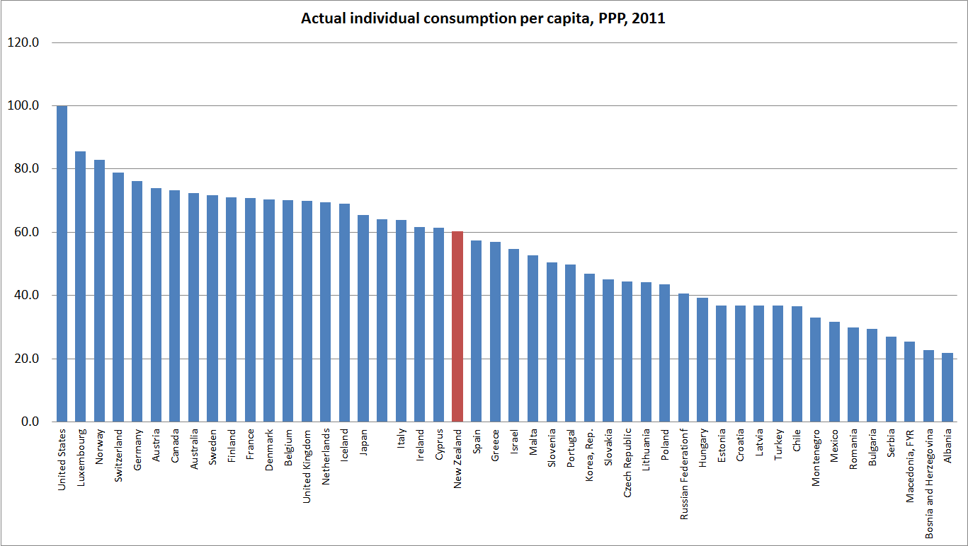 • And what about the many other consumption items.  For example, clothes, or restaurant meals, or foreign holidays (the latter more costly here than in, say, Belgium).  Perhaps access to beaches and mountains is a plus here, but access to good newspapers, and great museums and art galleries certainly weighs in favour of people of most of these countries over New Zealand.  And what of health or education spending –  actual individual consumption, but often provided by the state?