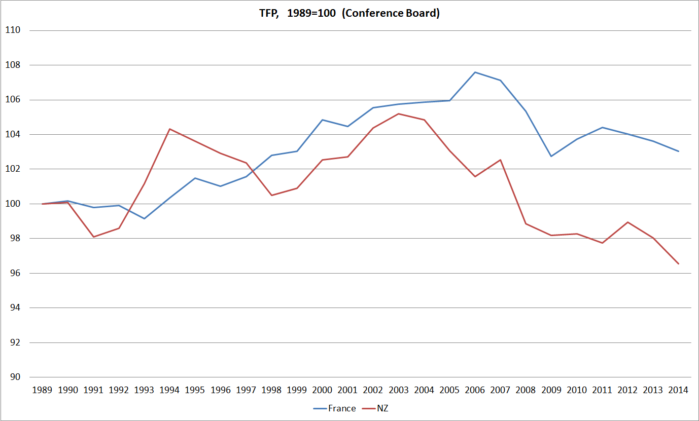 And if neither country’s MFP growth has been particularly impressive, over the period for which the Conference Board has published detailed estimates (since 1989), New Zealand’s has been worse than France’s. Indeed, France was almost the median OECD country over the full period.