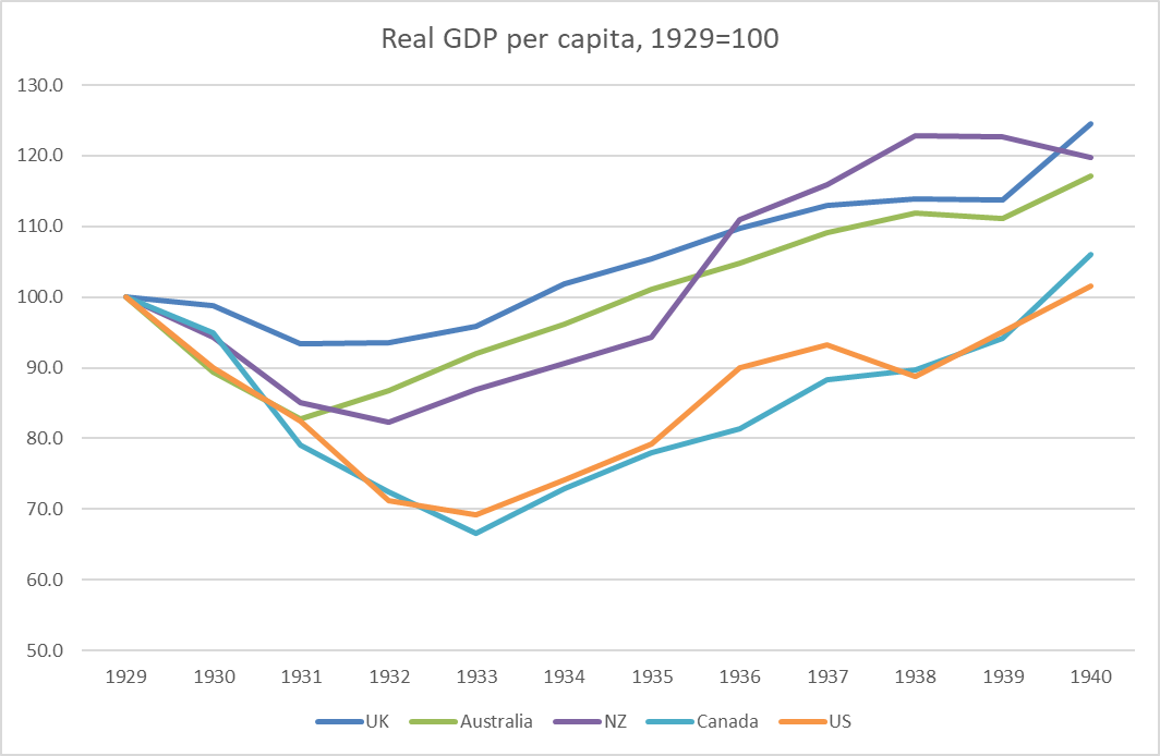 And just finally, they arranged for an American professor, Eric Leeper, to speak, via Zoom, on monetary and fiscal issues. Leeper is pretty highly-regarded and has visited New Zealand previously. He is also very keen on a much greater use of fiscal policy and, it would appear, more debt (for various reasons including, he said. “the rise of the right” which didn’t seem quite relevant to New Zealand, let alone a good basis for official advice). Anyway, after the geeky bits of the presentation, he tried to make his case by reference to the Great Depression. He is clearly a big fan of Franklin Roosevelt, and was talking up the fiscal aspects of Roosevelt’s approach (while barely really mentioning the substantial monetary bits). But it was odd. Here he was talking to a New Zealand audience, championing the use of fiscal policy in the US Great Depression, but seemed quite oblivious to the fact that the US was one of the very last countries to get back to pre-Depression levels of output and unemployment. Here is the experience of the Anglo countries.