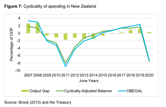 Quite a bit of Treasury’s thinking – or at least their marketing – seems to have been shaped by the success of the wage subsidy scheme. And it was a success – getting money out the door quickly, at a time when the government had just done the unprecedented and (a) shut the borders, and (b) simply compelled most people not to go to work, or do anything much else. It provided immediate income support, and probably had some beneficial effects beyond that (some smart person might attempt to model what difference it has made to outcomes not just last March/April but now). But it isn’t exactly a conventional event of the sort we can expect to see every cycle. And the primary consideration wasn’t really macroeconomic stabilisation at all – the whole point of the lockdowns was to aggressively (but temporarily) reduce activity, including economic activity – but income relief/support (as unemployment benefits have an incidental automatic stabiliser benefit, but aren’t primarily about macroeconomics). There are always going to be one-off events when the the government’s spending capabilities need to come into play – one can think of earthquakes (where fiscal measures and monetary policy will often tend to work in opposite directions, since earthquakes cause real disruptions and significant wealth losses, and but also generate a lot of fresh (reconstruction demand), plagues, wars, and so on. But it is seems like a category error to use such episodes as the basis for some sort of generalised play for more routine use of discretionary fiscal policy with cyclical stabilisation in view, when most recessions are quite different in character.