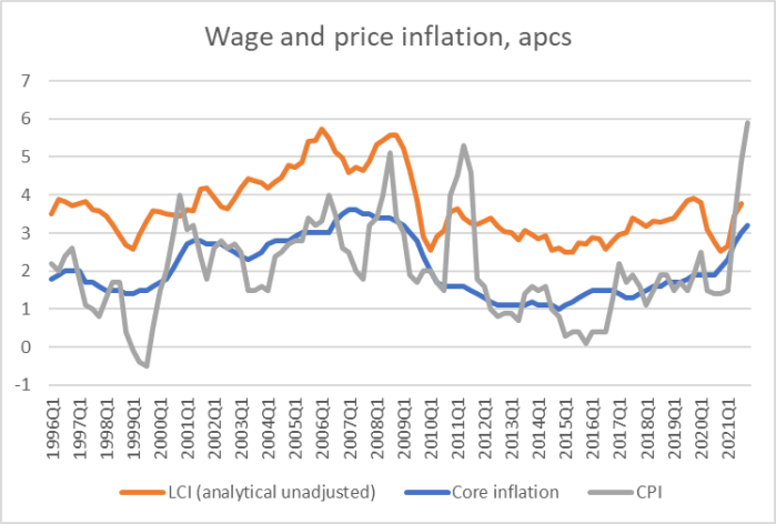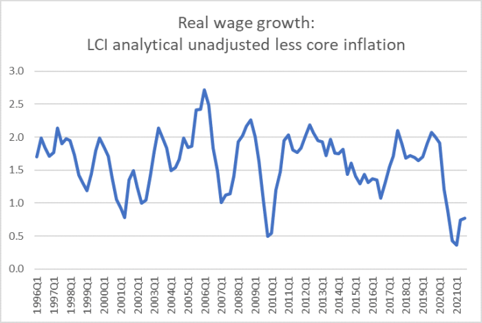 (None of this means wage earners aren’t now earning less per hour in real terms than they were a year ago, but that drop is, to a very considerable extent, unavoidable. The gap between headline and core inflation is typically about things that have made us poorer, for any given amount of labour supply.)