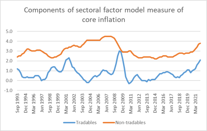 Because the model looks for trends, the big moves in this measure of core tradables inflation have often reflected the big swings in the exchange rate – which affects pretty much all import prices – but this time there has been no such swing. Just a lot more generalised inflation from abroad (as well as the one-offs that this model looks to winnow out). So a lot more (generalised) inflation from abroad – not something to discount – and a lot more arising from domestic developments (demand, capacity pressures, and perhaps some expectations effects too). It is a generalised issue – above target, and probably rising further (both from the momentum in the series, and continued tight labour markets and rising inflation norms).