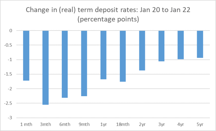 So nominal mortgage rates are perhaps 50 basis points higher than they were two years ago. But inflation is a lot higher than it was then, and so are all indications of inflation expectations. For these purposes, I’ll just use the Reserve Bank’s own survey of two-year ahead inflation expectations: 1.93 per cent in the survey done at the end of January 2020, and 3.27 per cent in the survey done a few weeks ago, an increase of 1.34 percentage points.