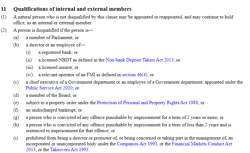 But in the end, the Governor did answer. He claimed first it was a matter of “legislation and government”. What he might have meant was not clear, but here is what the legislation says. The Minister makes the appointments, but can only appoint people the Board recommends, and the Board has to consult the Governor on those recommendations. These types of people are (rightly) disqualified.