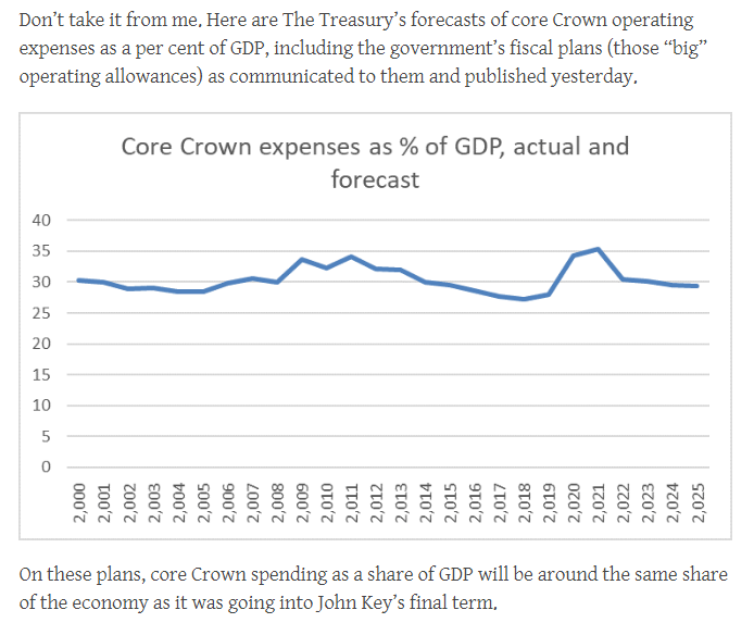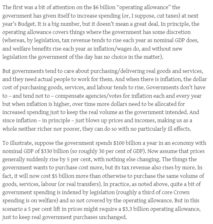 A very large proportion of that $6 billion operating allowance will be required simply to keep real spending at the levels the government had in mind in last year’s Budget. It is a really big price level shock, at a time when – almost every year – nominal GDP is at record highs, so it is hardly surprising that the operating allowance is itself a record high. It tells one nothing about fiscal profligacy. I suspect Labour is already finding putting together this year’s Budget quite a bit harder than they planned in December – harder that is if they are going to stick to the $6 billion.