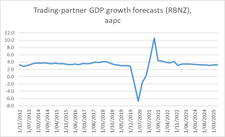 One of the startling gaps in the document is any discussion of history – past successful substantial reductions in core inflation. Surely with all those economists on staff they would have been well-placed to have provided us with some thoughtful insights on lessons/experiences? But I guess that might have involved acknowledging that it is very rare – almost unknown – to see significant reductions in core inflation without also experiencing a recession (often quite a nasty one). A recessionn isn’t strictly necessary. but perhaps the MPC could have enlightened us on why they think one will be avoided this time. As it is, search the entire document and you will not once find the word “recession” – not as a risk, not as a phantom the Bank thinks will be avoided, nothing. It seems quite a gap (and in fairness when the Governor was asked at FEC about the possibility of recession, he did note the wide margins of uncertainty, even if he tended to focus all the risk discussion on the big world out there, not on New Zealand.