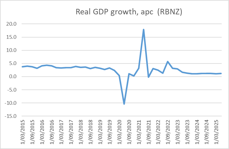 But all that was a little odd too because as the Governor noted a lot of countries are grappling with similar inflation and excess demand pressures to those in New Zealand. But on the forecasts/assumptions the Bank is using their inflation largely goes away again, and GDP growth just settles back to something pretty normal. Sure, some of the one-offs around food and energy etc will probably settle down, but the Bank seems to be assuming the ultimate in global soft landings. Quite why isn’t clear.