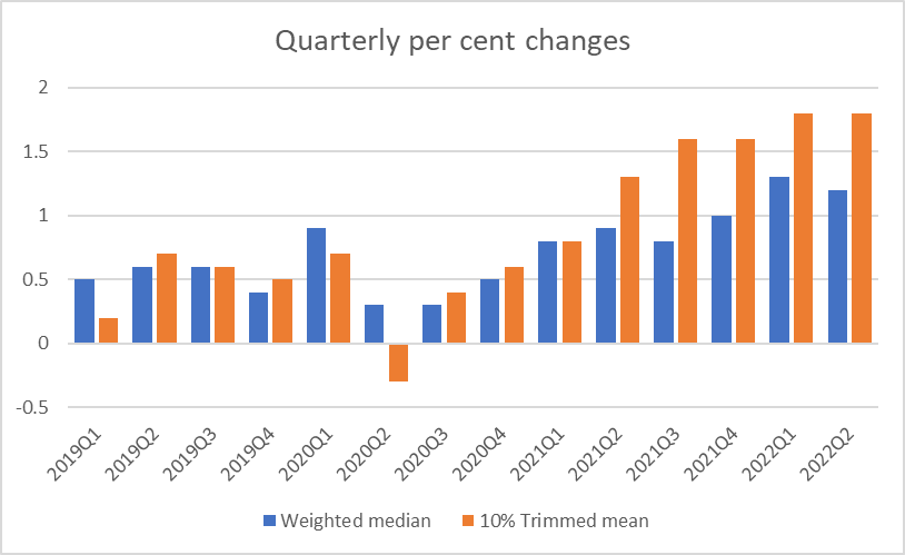 Here are the trimmed mean and weighted median measures (note that you cannot just multiply these by four to get an annualised rate)