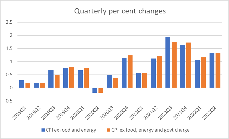 Every single one of these series show a (not unexpected) trough in quarterly inflation in the June quarter of 2020 (the first, out-of-the-blue, “lockdown”). But more than a few also suggest that the sharpest increases in the inflation rate were occurring a year ago (perhaps 12-18 months on from the biggest fiscal and monetary stimulus), and that since then the quarterly inflation rates have been (high but) fairly stable or, on some measures have already fallen back a bit. And most of the most recent observations date from a time when the OCR was only just getting past 1 per cent.