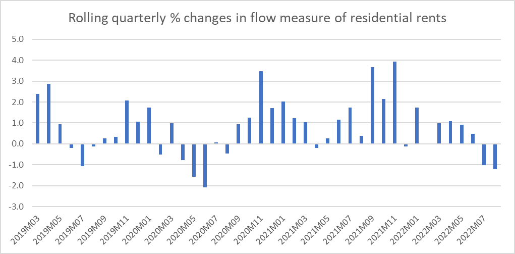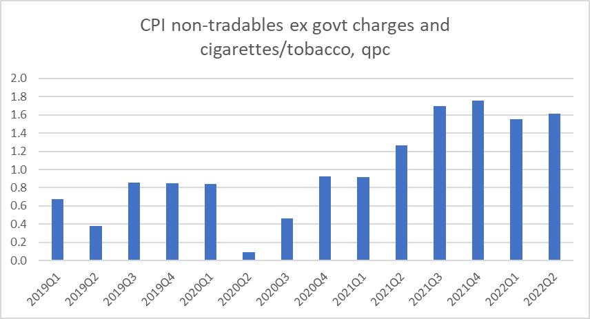 And then there are the core inflation measures. Much of the media and political attention has been (perhaps understandably) on the annual rate of inflation (complete with petrol tax cut distortions). That annual rate may well have fallen back a bit in September (petrol prices and all that), but it shouldn’t really be the focus. Ideally, we want to look at quarterly core meaaures – indicators of what is happening behind the headline “noise”. (And here the Reserve Bank’s factor model measures aren’t very useful, since they work on annual change data and thus often in effect function as lagging indicators in the face of big changes, even if they probably often provide the best medium-term and historical view.)