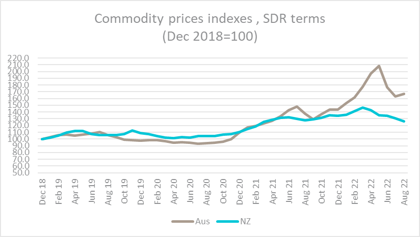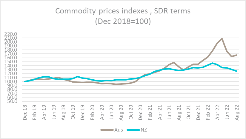 Third, if international New Zealand export commodity prices aren’t exactly weak, they are nothing like as strong as those in Australia (ANZ and RBA series respectively in the chart).