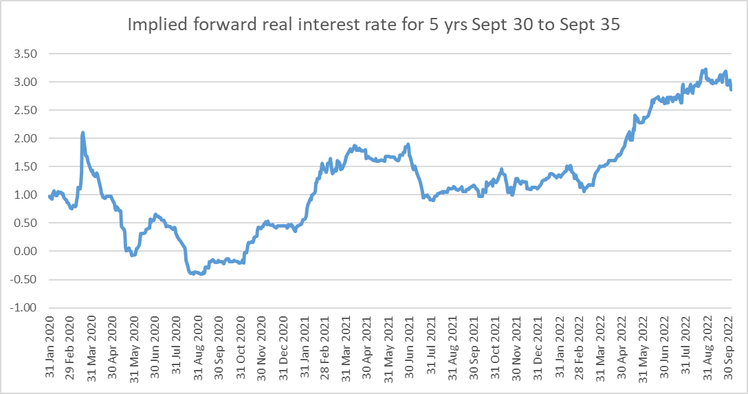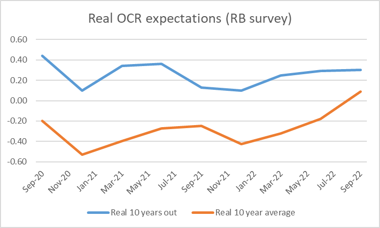 In this chart I’ve taken the yields on the Sept 2030 and Sept 2035 government indexed bonds and backed out the implied real rate for the five year period between Sept 30 and Sept 35 – a period which encompasses the 10 years ahead OCR question for the period the Bank has been running the survey.