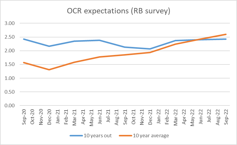 The survey has long asked about expected near-term policy rates (previously the 90-day bill rate as proxy, more recently the OCR) but in 2020 they added two new questions, asking respondents where they thought the OCR would be in 10 years’ time (describing that as a proxy for a neutral rate), and what they thought the average OCR would be over the next 10 years. I thought they – and especially the first question – were good additions to the survey (if we could get individual MPC members to give us their numbers, akin to the Fed’s dot-plot it would be even better).