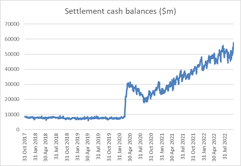 In New Zealand, for example, total settlement cash balances have just been hitting new highs, in excess of $50 billion