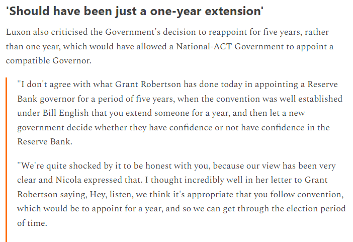 There is simply no foundation to what Luxon is saying about what happened in the past. Since the Reserve Bank was made operationally independent in 1990, there have been two cases in which a Governor’s term has expired in election year but before the scheduled election. The first was in 1993, when Don Brash’s term expired on 31 August. The 1990 election had been held on 6 November 1990, so presumptively any new term was going to start within three months of the 1993 election. As it is, and partly to allay any possible market concerns (these were still fairly early days), Don’s reappointment was made and announced very early (if memory serves correctly in late 1992). I don’t recall any particular controversy about that reappointment (although the then Prime Minister had not been a huge Brash fan), but then Brash had initially been appointed by a Labour government (and the then Labour leader and finance spokesman had both sat in the Cabinet that had appointed him).