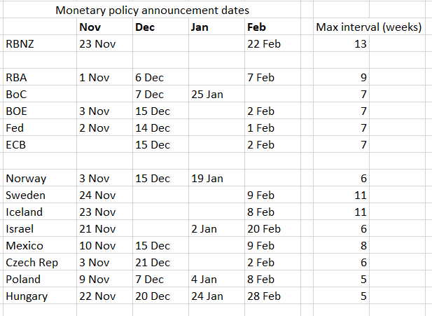 The MPC should be announcing on Wednesday (a) an extra OCR review for a few days after the CPI release in January, and (b) a commitment to revisit the meeting schedule for future years to bring the length of the long summer break back to (say) no longer than the one the RBA takes. If they don’t journalists at the press conference and MPs at FEC should be asking why not.