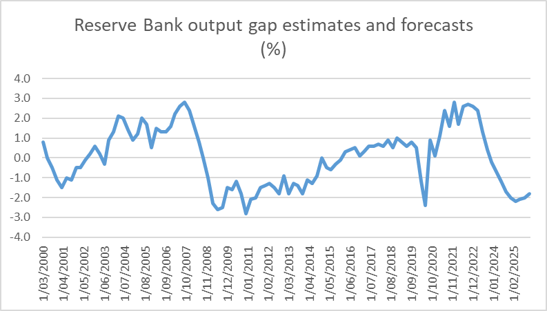 Finally, it is constantly worth bearing in mind the scale of the task. Core inflation has been running around 6 per cent and should be close to 2 per cent. That scale of reduction in core inflation hasn’t been needed/sought since around 1990. In 2007/08 inflation had got away on us to some extent, but a 1.5 percentage point reduction would have done the job of getting back to around 2 per cent. As Westpac pointed out in their commentary, the scale of the economic adjustment envisaged in these forecasts (change in estimated output gap) is very similar to what (the Bank now estimates) we experienced over 2008 to 2010.