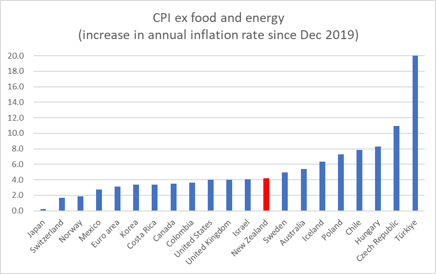 On the most recent data, for the only internationally comparable measure of core inflation we readily have, New Zealand’s core inflation rate now – a year on from the first OCR increase – is nothing special, being just above that of the median OECD country. If we focus only on OECD countries with their own monetary policies (and the euro area as a single observation) we get this chart showing the increase in the core inflation rate since just prior to Covid (actual Turkey increase is far larger than the scale allows).