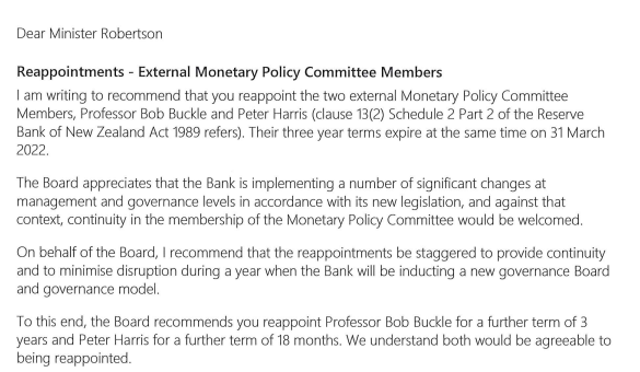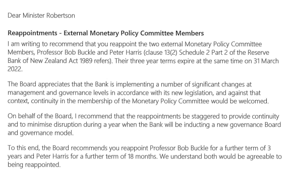 On which note, I had another OIA request back the other day, which included the letter from the Reserve Bank Board chair to the Minister of Finance recommending those reappointments. It was perhaps even more lame than I had expected. There was no attempt to evaluate or describe the contributions Buckle and Harris had made, nothing at all about the rapidly rising (core) inflation backdrop for which they shared responsibility, no suggestion of having considered any alternative candidates (neither Buckle nor Harris are young). In fact, the strongest (only) argument for reappointment seems to have been that “the Bank is implementing a number of significant changes in governance in accordance with its new legislation”, even though almost none of the 2021 Act had anything to do with monetary policy or the MPC