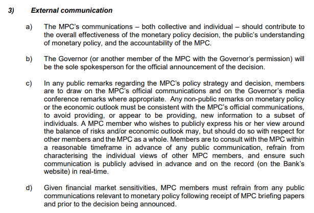 Note that the Charter does not prevent – in fact explicitly allows for – members from expressing “his or her view around the balance of risks and/or economic outlook”. As the Governor put it last week, there are some courtesies to be observed (let your colleagues know in advance, don’t attack other individual members’ views in public). And there is the requirement that “such communication is advised in advance and on the record (on the Bank’s website) in real-time”. There is certainly no obstacle to recent MPC members reflecting on what has passed, or on the structure, processes etc of the MPC. Note too that the Charter applies to all MPC members, not just the externals