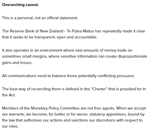 That final provision in c) looks to have been designed to cater for MPC member speeches. It is easy to announce in advance that an address will be being given and to commit to release the text on the Bank’s website when the address is being given. Whether speakers stick to their written text – Orr apparently rarely does – is perhaps harder to police.