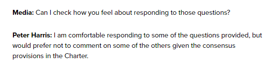 Before proceeding further I should say that I didn’t think all the questions to Harris were particularly well-framed. But it is pretty standard media advice that you answer the question you want to answer. If the question is ill-phrased or not really to the point, answer another one. And if you and your organisation are really committed to being “transparent, open, and accountable” do it in an open, constructive and positive way, not grudgingly or petulantly.