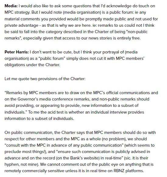 Note, however, that there was no advance notice of the Harris interview, so the Bank – which issued the statement on Harris’s behalf – appears to have been complicit in breach of the Charter. More generally, although the text of this interview is available on the Bank’s website, no other interviews by MPC members are (in the last few days for example, Conway with Bernard Hickey, Hawkesby with Stuff, Silk with Reuters – as it happens, each of those MPC members talking about more market-sensitive stuff than Harris ended up doing). It isn’t uncommon for (internal) MPC members to give interviews to media outlets and (a) never provide transcripts, and (b) which are behind paywalls. The Charter looks like it could do with an amendment to require that the text of any media interview with an MPC member in their MPC capacity should be published on the Bank’s website simultaneously with the story published by the interviewing outlet. That is the sort of approach an organisation seriously committed to transparency would take.