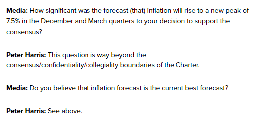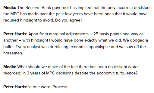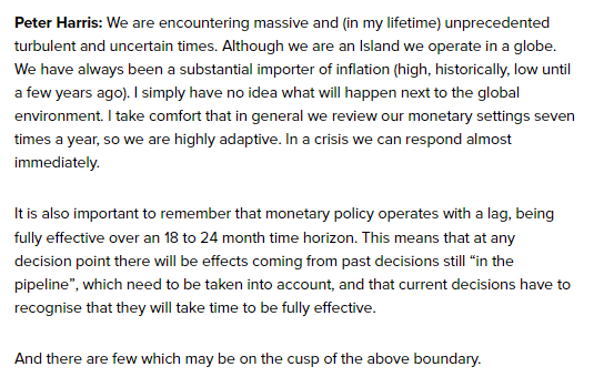 He does go on after the one word (“Process”) to describe that process. The internal process doesn’t sound to have changed much since the decades I spent on the internal advisory MPC/OCRAG, but perhaps it is worth noting that in those days unanimity among the Governor’s advisers (it was then finally solely his call) wasn’t that common – in fact, successive Governors had us each put our recommendations in writing, initially without seeing what others were recommending, precisely to limit the risk of groupthink or peer pressure towards the end of the process. It is a very poor reflection on all involved that through the period of great uncertainty and the worst monetary policy stuff-up since the 1989 Reserve Bank Act gave the power to the Bank, not one MPC member, not even once, felt and reasoned sufficiently strongly as to dissent, on anything. Even now, no external MPC member has given us their own accounting for the handling of the last three years (beyond Harris’s “with hindsight we did it right”). Note that the recent Reserve Bank self-review is a management document, and I have an OIA request in at present to try to learn what the externals contributed and whether or not they agreed.
