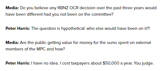 Surely the first of those questions could have been treated as an open invitation to talk expansively about how “I can’t be certain about that, but let me tell you about what I think I as an external member have been able to bring to the table [as someone with decades of experience in New Zealand economic policy, strong connections to the labour market, as someone standing outside the day to day pressure staff and management face, as someone willing to ask awkward questions as part of a confidential deliberative process] – or whatever value he thinks he has offered.