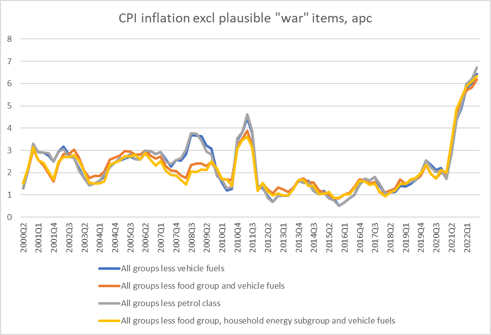It was just a mind-boggling claim – not that any MP on the FEC seemed to be alert enough to notice. It seemed to be implying that if we abstracted from the direct price effects of the war, inflation would otherwise be in the 1 to 3 per cent per annum target range. But here is what those data show, using the SNZ exclusions covering both fuel individually and fuel and food.