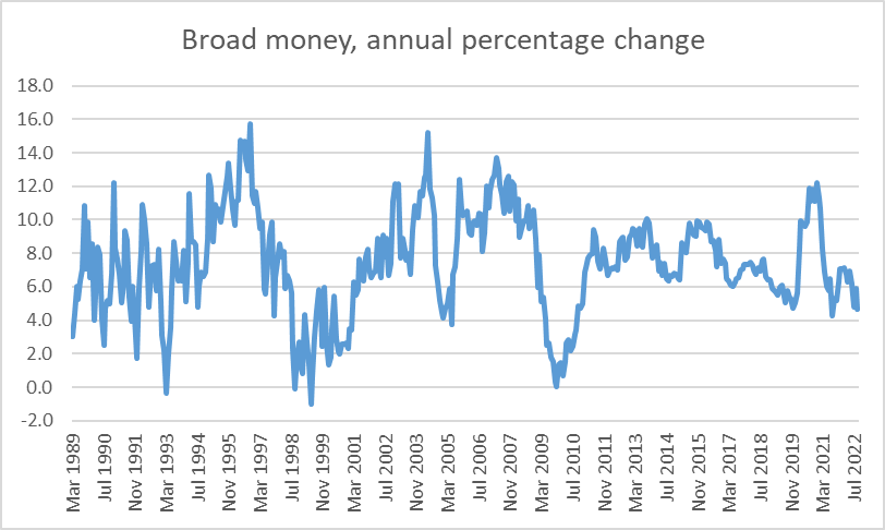 If you are now drumming your fingers are thinking this is all very technical and not really to the point, then in some respects you are correct. We’ve heard a lot about “the money supply” in the last couple of years. Most of it isn’t very accurate, but in many respects the difference doesn’t matter very much. “Money supply” measures (the formal ones referred to above) have not mattered very much to central bankers for decades, and that has been so whether inflation was falling sharply and undershooting inflation targets, or (as at present) proving very troublesome on the high side. The general view has been that money supply measures have not contained consistently useful information about the outlook for inflation, over and above what is in other indicators.