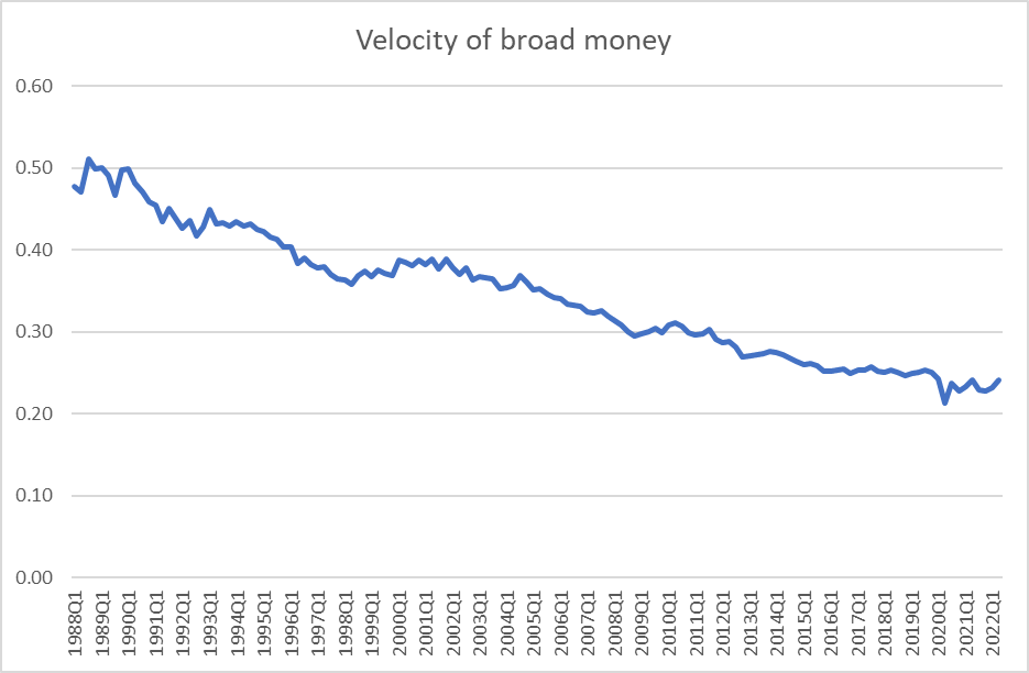This measure of the money supply has been been growing faster than nominal GDP pretty much every year since 1988 (mostly just reflecting the fact that regulatory restrictions on land use have inflated house prices to absurd levels, driving up both money and credit as shares of GDP). You can see a bit of noise in 2020 – the big initial increase in the money supply I mentioned earlier and the temporary sharp reduction in GDP – but two years on there is nothing now that looks unusual.