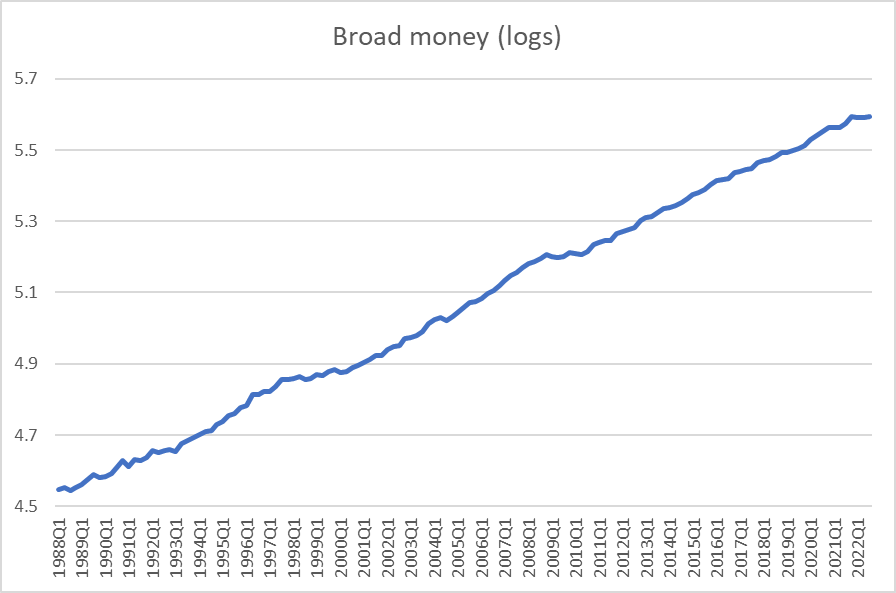 Here is a chart of the level of broad money, expressed in logs (which means that if the slope of the line is unchanged so is the percentage rate of growth in the underlying series).