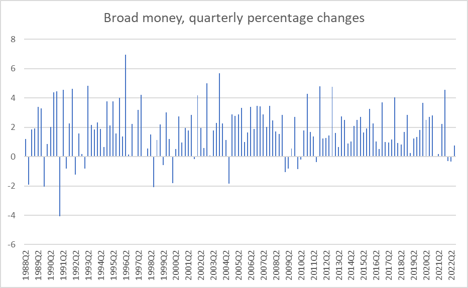 But for anyone out there who still wants to put some weight on this official measure of the broad money supply, here is the chart of quarterly percentage changes.