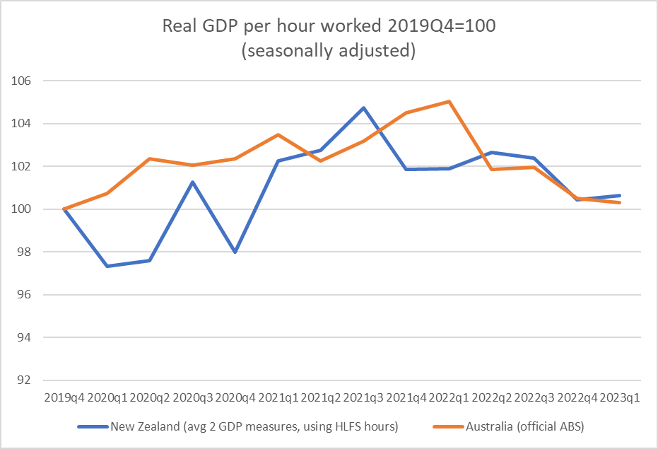 Covid messed up those estimates. For example, under the wage subsidy scheme a lot of people were being paid (as a matter of policy) for hours they were forbidden to, or were otherwise unable to, work. And on a more enduring basis, we now have a higher baseline level of sickness, which comes and goes with waves of Covid, and so for the time being I’m just using the HLFS measure of hours (since it is measuring the hours people tell SNZ they were actually working for). It also then allows for a more-direct comparison with the official ABS real GDP per hour worked series for Australia.